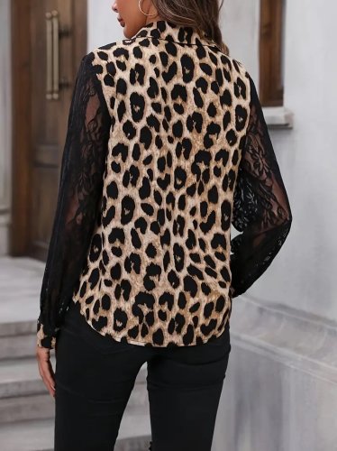 • Kadın leopar desenli kolları tül detaylı krep bluz