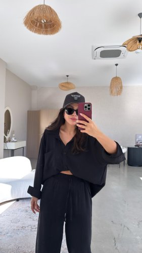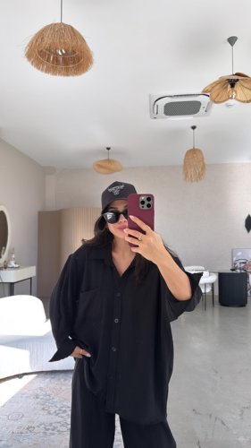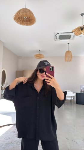• Kadın Flamlı keten tek cep oversızed gömlek