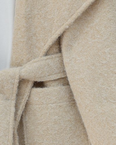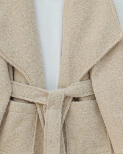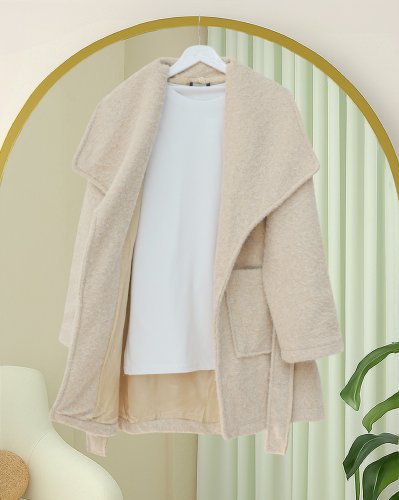 • Geniş Yakalı Beli Kemerli Cepli Kaşe Kaban Bej