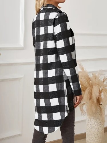 Kadın uzun kollu ekoseli önden düğmeli dokuma uzun gömlek