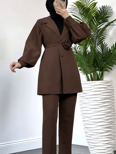 Kemeri Gül Detaylı Kruvaze Yaka Ceket Pantolon Takım Kahve