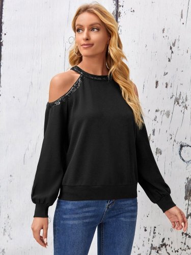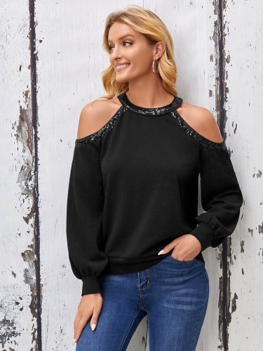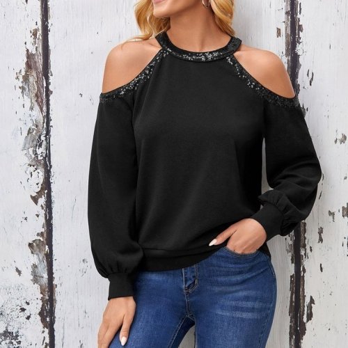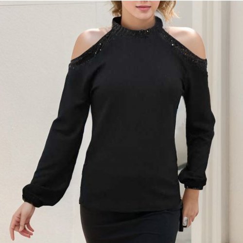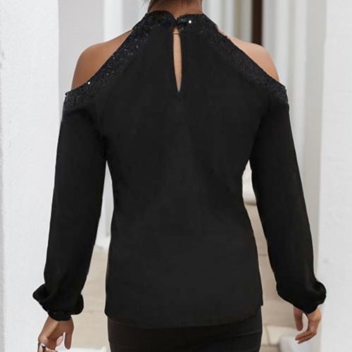 • Kadın uzun kollu bisiklet yaka omuz açık detaylı krep bluz