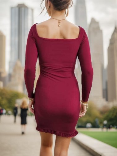 • Kadın uzun kollu derin V yaka göğüs altı dekolte detay etek ucu fırfırlı sandy mini boy elbise