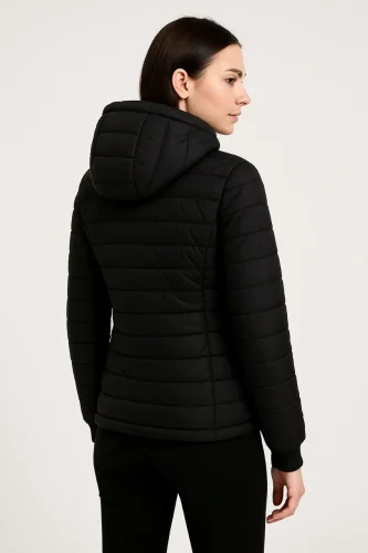 Şişme Kapüşonlu Fermuarlı Mont Su itici Kapitone Astarlı Kumaş Cepli Kışlık Rahat Kalıp Siyah