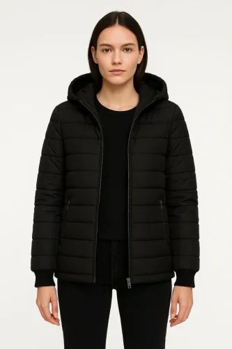 • Şişme Kapüşonlu Fermuarlı Mont Su itici Kapitone Astarlı Kumaş Cepli Kışlık Rahat Kalıp Siyah